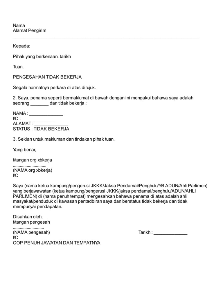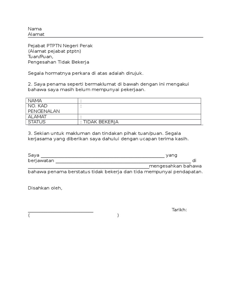 Surat pengesahan tidak bekerja docx. Contoh surat akuan bujang bagi yang bekerja sendiri. Dasar tersebut boleh dirujuk melalui portal ptptn atau ppn/ ppc yang berhampiran. Surat pengesahan tidak bekerja ptptn pdf. Surat pengesahan pendapatan ibu bapa tanpa slip gaji pdf bioconmortmo.